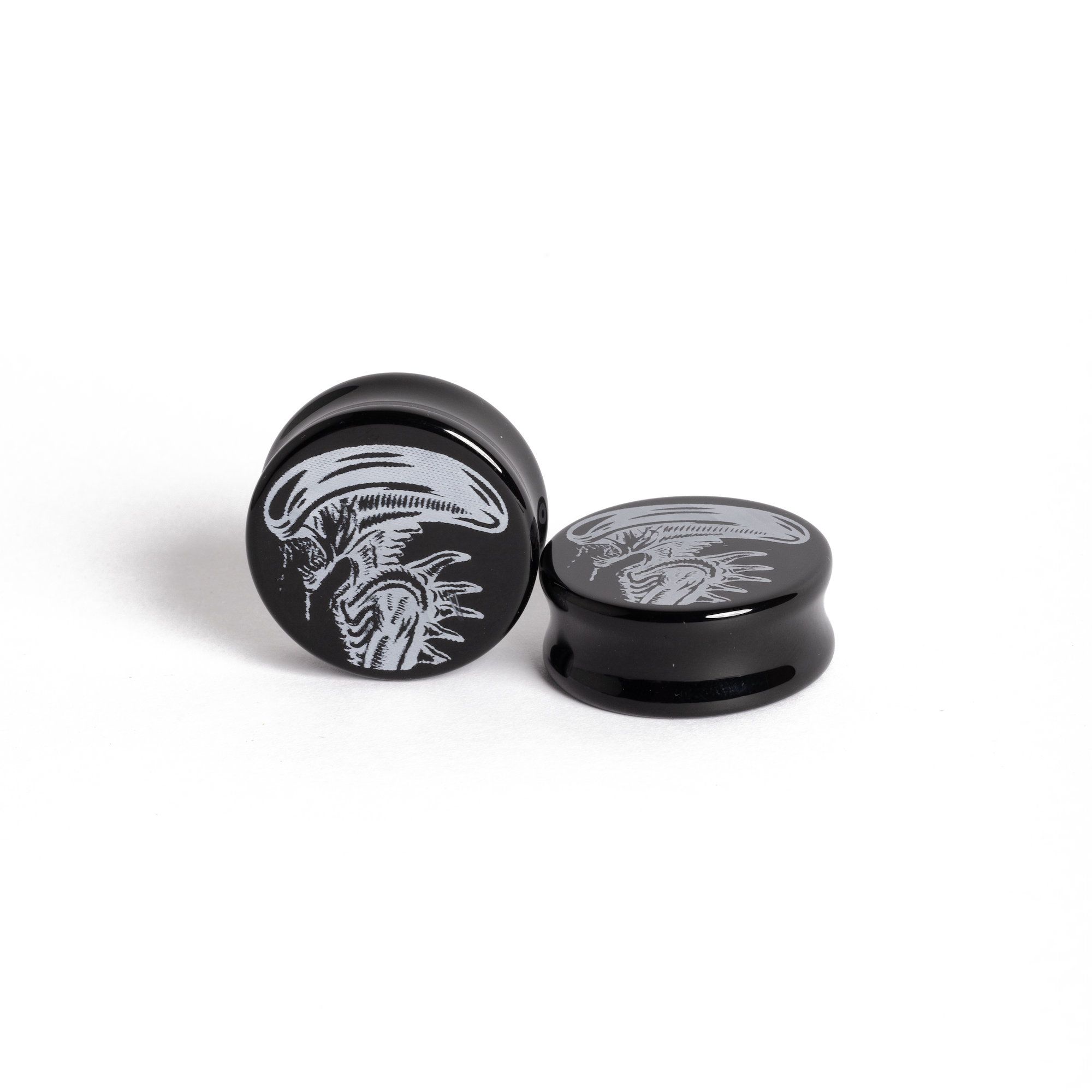 A beautiful pair of our Black Agate Stone Plugs with an engraved design on the front.