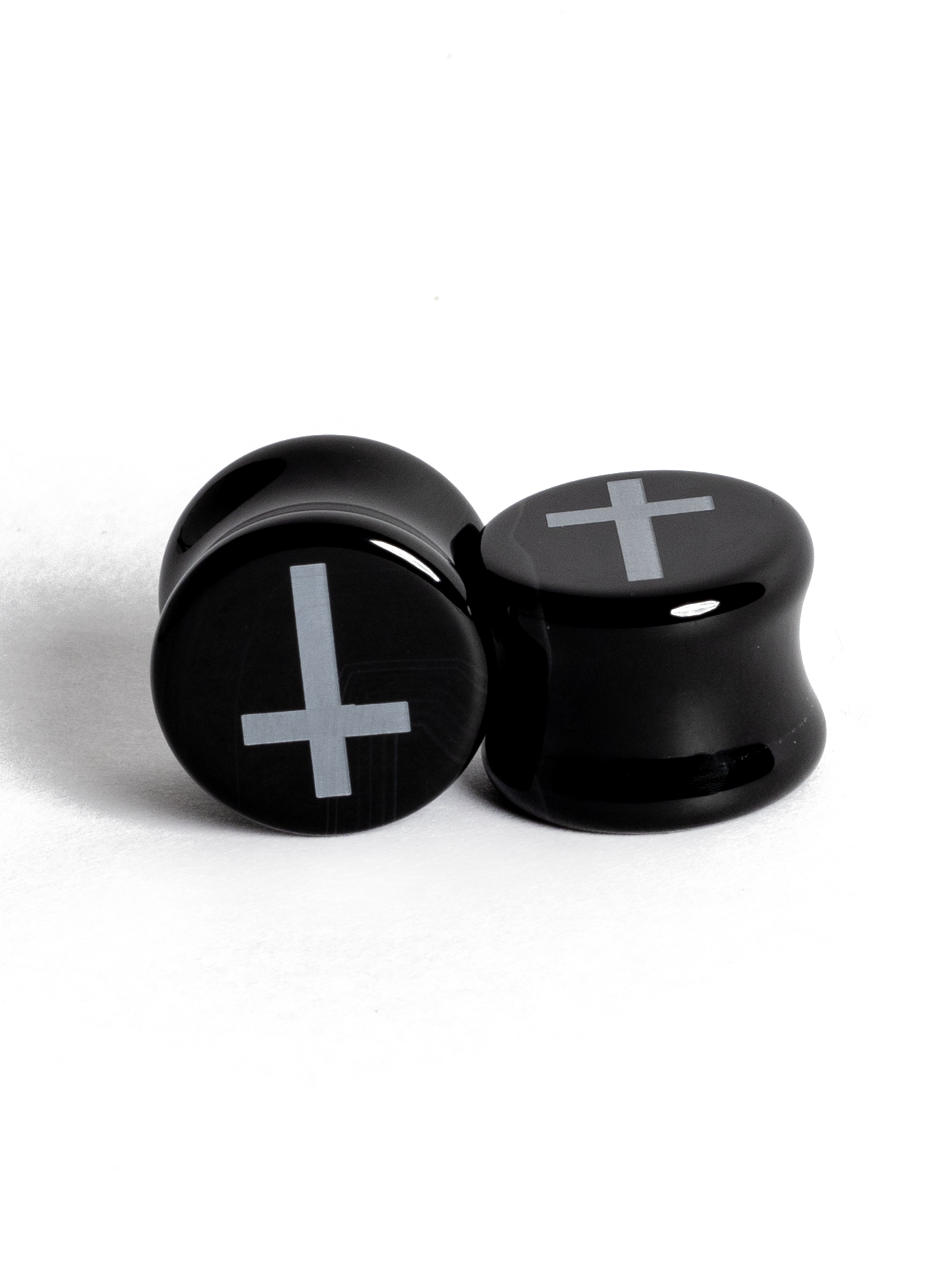 A beautiful pair of our Black Agate Stone Plugs with an engraved design on the front.