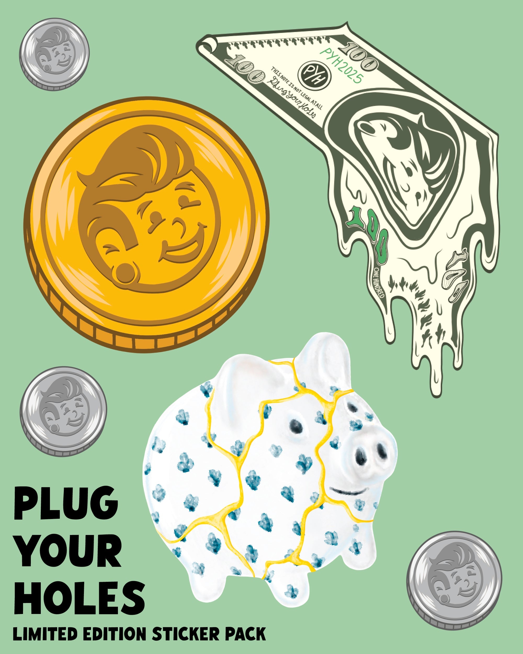 Designed and printed in-house, PYH exclusive multi sticker sheet - featuring our exclusive piggy bank, Plug Boy coin & melty money designs.